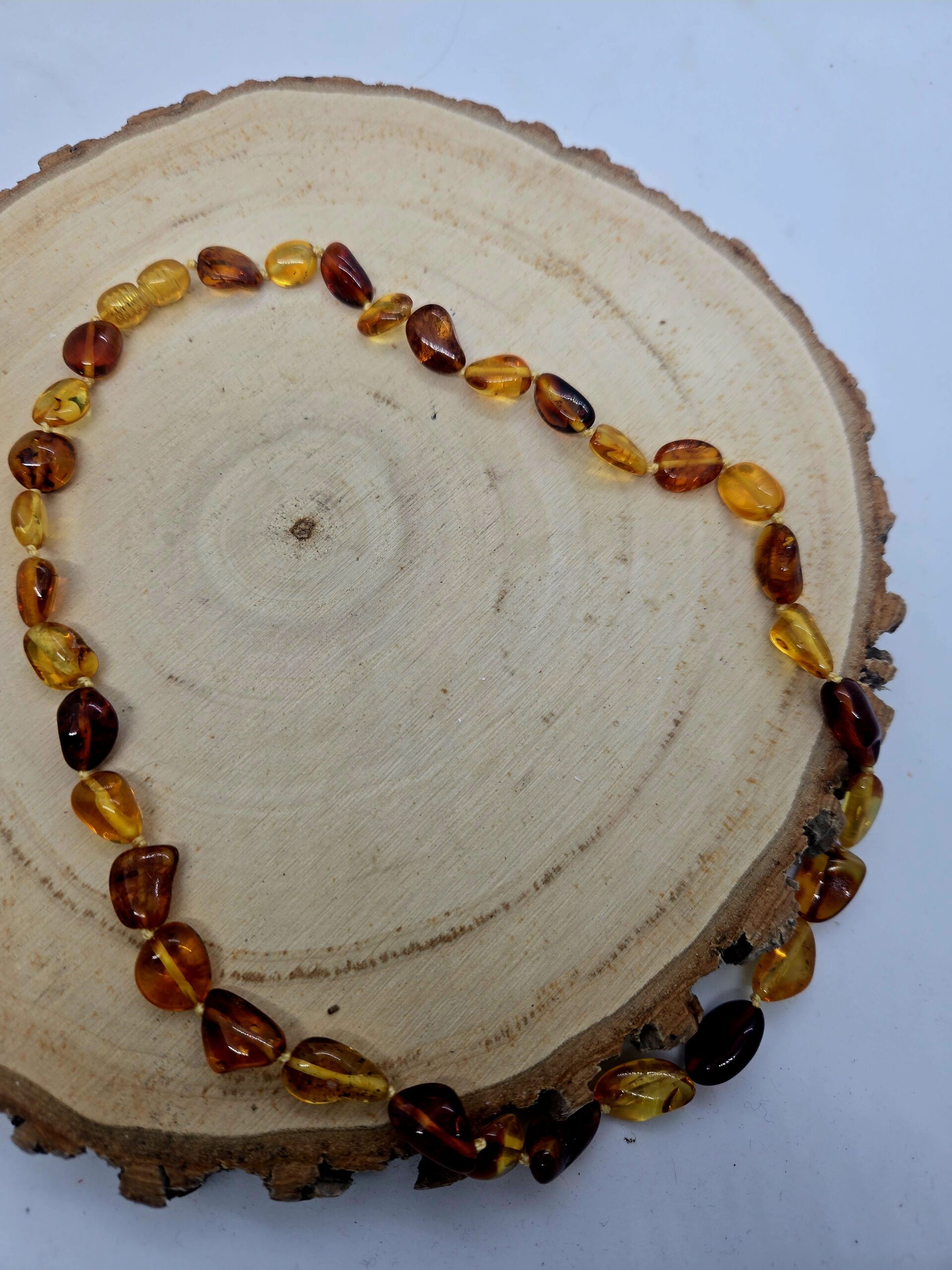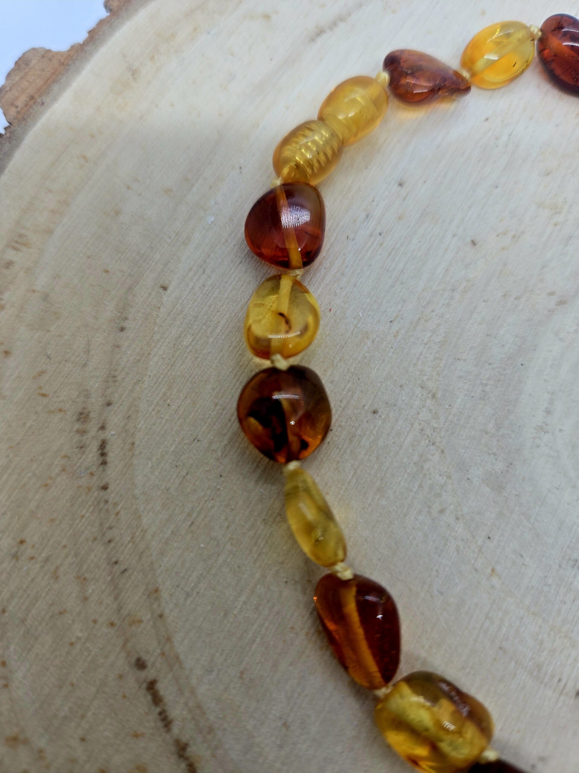 Este colar é composto por pedras irregulares em tons de âmbar mel e âmbar whisky.