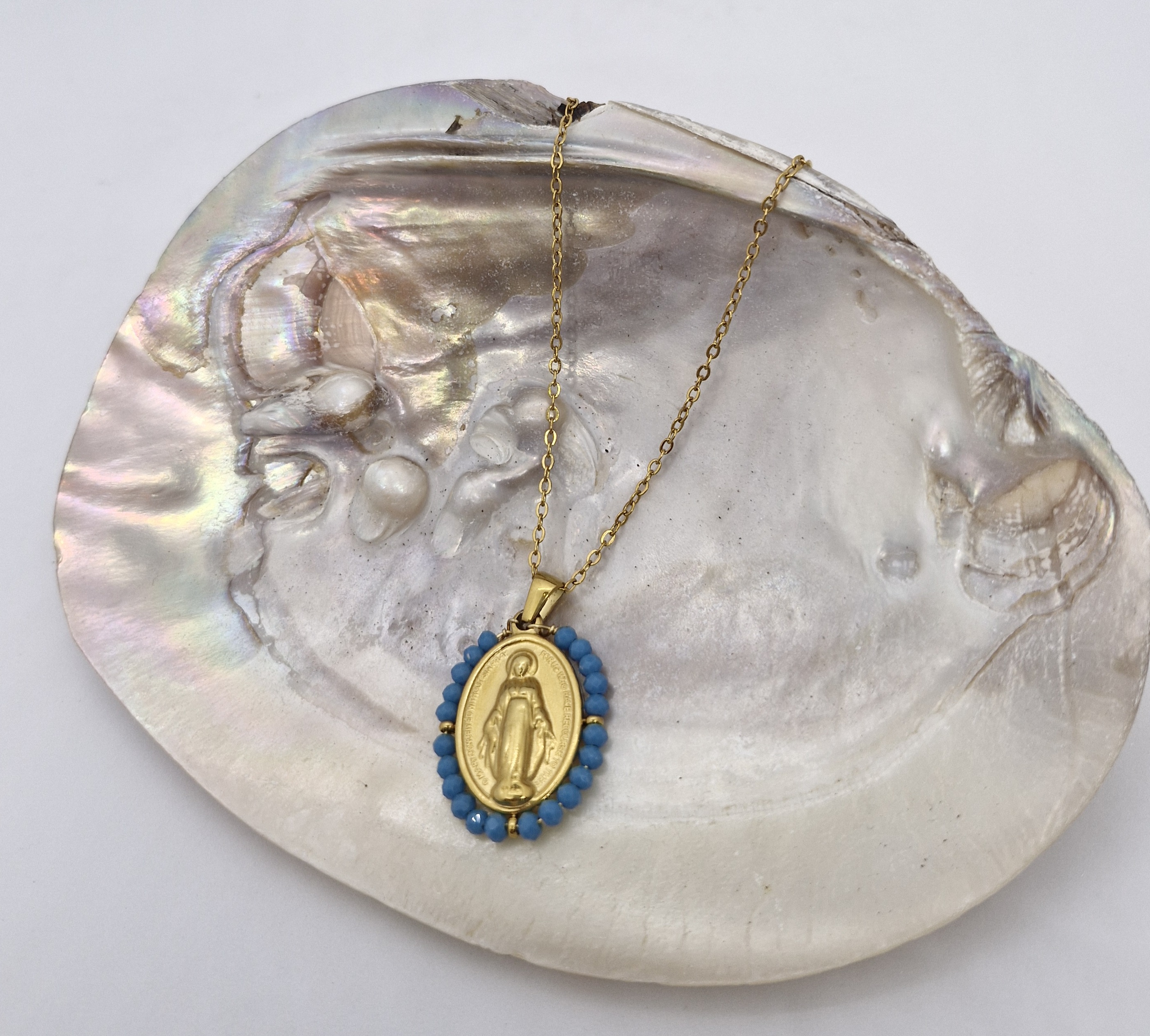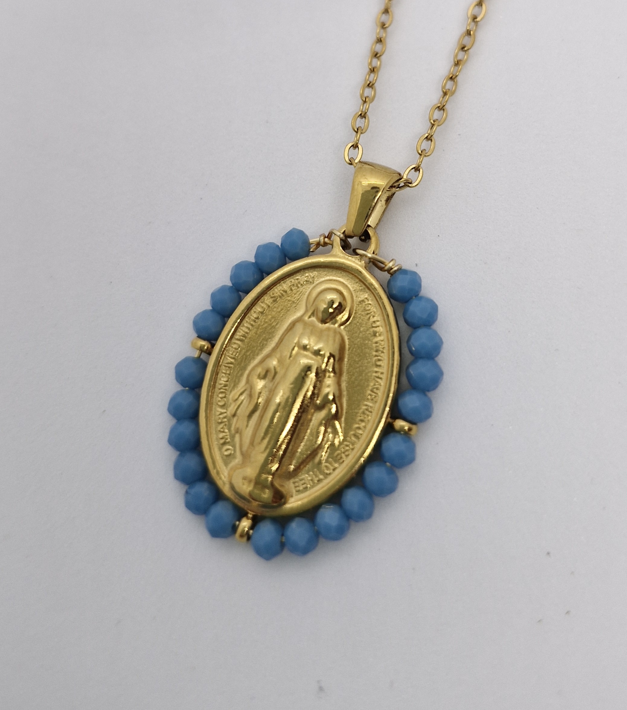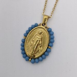 Colar Santinha em aço inoxidável. Com cristais coloridos.