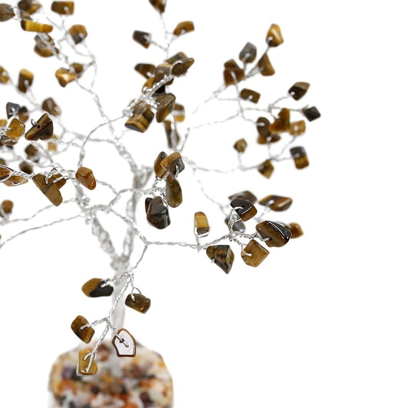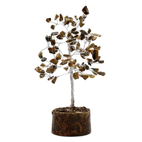 Árvore Feng Shui 100 pedras de (Olho de Tigre) em base de madeira. Os ramos são flexíveis. Mineral do amor incondicional e da paz infinita.