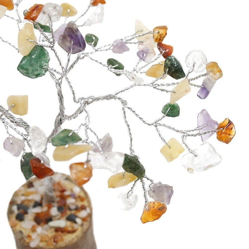 Magnífica árvore Feng Shui de gemas semipreciosas. Esculpida à mão e montada sobre uma base de madeira decorada com uma mistura de pequenas pedras de cores variadas. Sua beleza reside na elegância e na simplicidade dos ramos de cor prateada compostos por 100 pedras naturais.