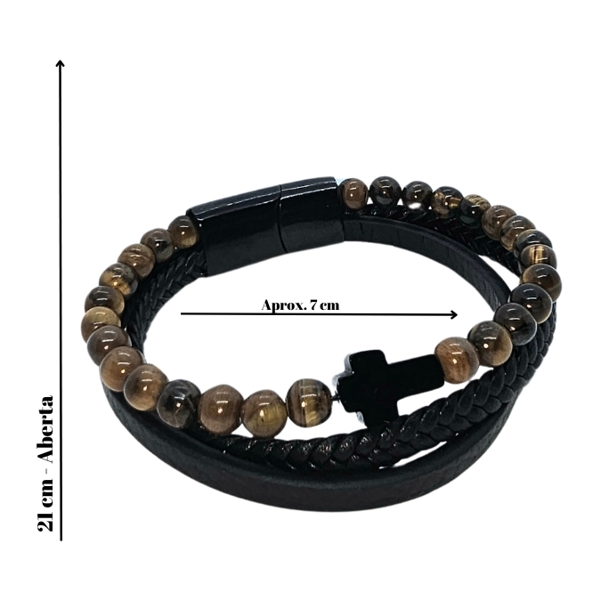 Pulseira Aço e Pele - CRUZ NEGRA + OLHO DE TIGRE