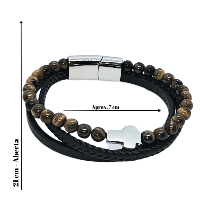 Eleve o seu estilo a um novo patamar com a pulseira de aço inoxidável com minerais naturais e pele sintética. Descubra a fusão entre tradição e modernidade, capturada em cada detalhe desta peça única.