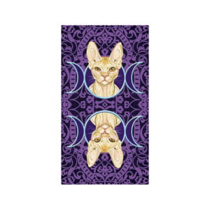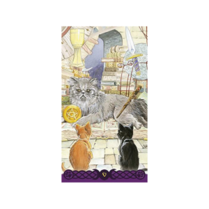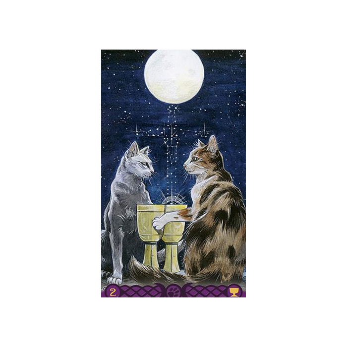 “Esses gatos “doces, travessos, brincalhões ou reservados” parecem viver em um mundo de todos os mundos, um reino de magia e poder. Quer sejam os familiares de um pagão ou os próprios bruxos, os gatos possuem uma sabedoria inata. Nessas cartas lindamente ilustradas, eles viajam entre os Arcanos e compartilham seus segredos conosco.
